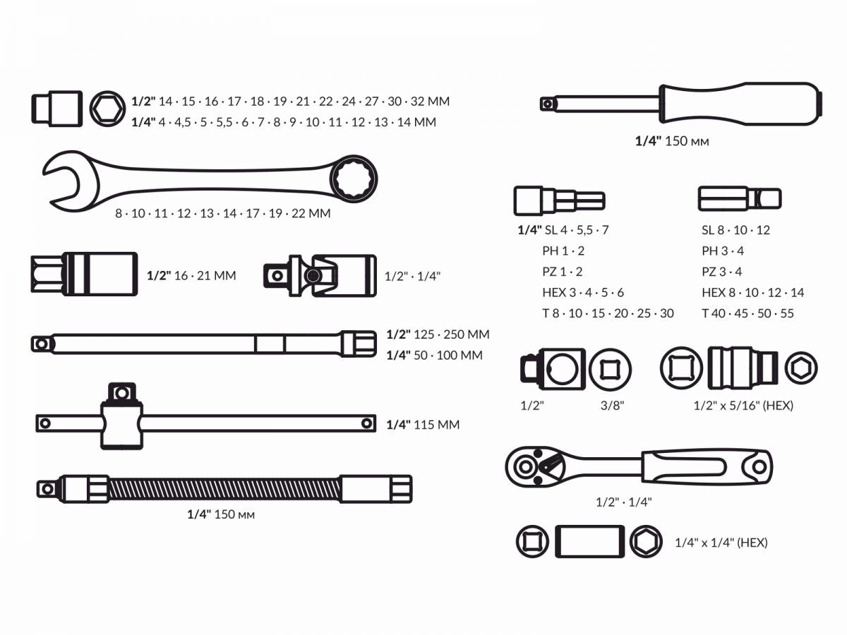 Ключ комбинированный: 8, 10, 11, 12, 13, 14, 17, 19, 22 мм;