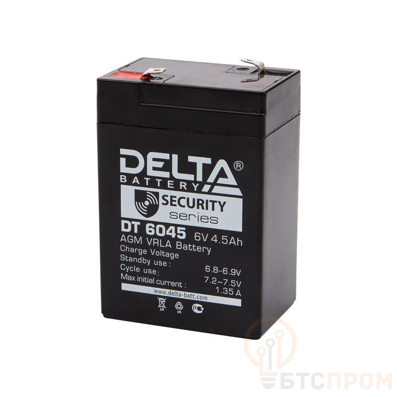 Аккумуляторные батареи используется в охранно-пожарных системах, системах контроля доступа, аварийного освещения. Могут использоваться в буферном и в циклическом режиме. Характеристики: Номинальное напряжение: 6 В Число элементов: 2 Срок службы: 5 лет Номинальная емкость: (25 °С) 20 часовой разряд: (0.225 А; 1.75 В/эл) 4.5 Ач 10 часовой разряд: (0.395 А; 1.75 В/эл) 3.95 Ач 5 часовой разряд: (0.733 А; 1.70 В/эл) 3.665 Ач Саморазряд: 3 % емкости в месяц при 25 °С Внутреннее сопротивление полностью заряженной батареи: (25 °С) 23 мОм Габариты: 70х47х107 мм