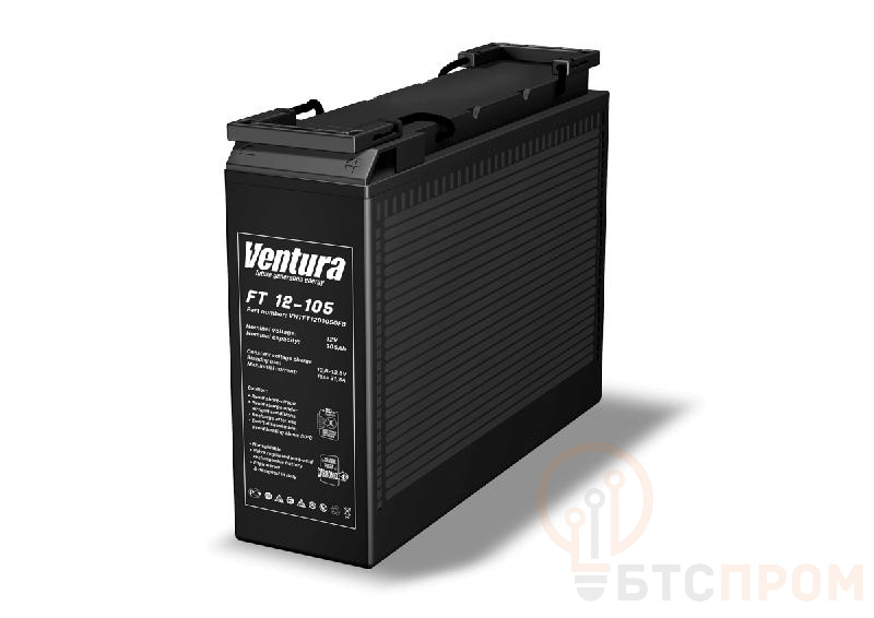 Аккумуляторная батарея Ventura FT 12-105 – это надежный свинцово-кислотный аккумулятор напряжением 12 В и емкостью 105 А·ч, предназначенный для длительного энергоснабжения. Модель выполнена по технологии AGM (Absorbent Glass Mat) с рекомбинацией газов, что обеспечивает ее полную герметичность, необслуживаемость и безопасную эксплуатацию в любом положении.