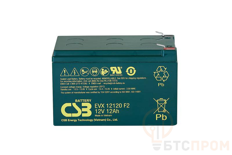 Аккумуляторная батарея CSB EVX12120 F2 — это надежный свинцово-кислотный источник питания, выполненный по технологии AGM (Absorbent Glass Mat) с клапанной регулировкой. Номинальное напряжение составляет 12 В, а емкость — 12 А·ч, что обеспечивает длительную автономную работу оборудования.