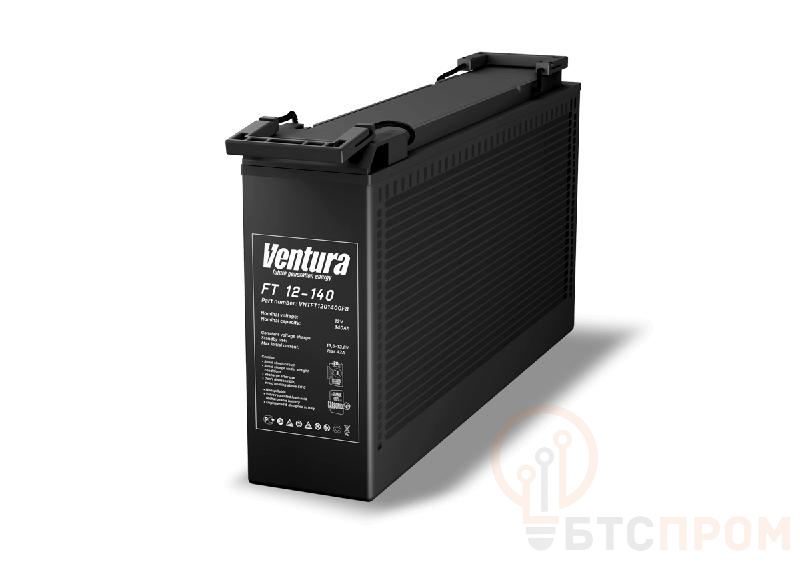 Аккумулятор Ventura FT 12-140 — мощная свинцово-кислотная батарея ёмкостью 140 А·ч, предназначенная для длительного энергоснабжения. Номинальное напряжение 12 В обеспечивает совместимость с большинством электросистем. Модель выполнена по технологии AGM (Absorbent Glass Mat) с рекомбинацией газа, что исключает необходимость обслуживания и позволяет безопасно эксплуатировать батарею в любом положении.