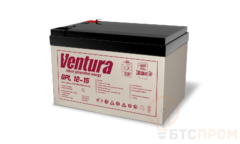 Аккумуляторная батарея GPL 12-15 Ventura — это надежный источник автономного питания с номинальным напряжением 12 В и емкостью 14 А·ч. Модель изготовлена по передовой технологии GPL (Gel Pure Lead) с использованием гелевого электролита, что обеспечивает абсолютную герметичность, не требует обслуживания и исключает риск утечки кислоты. Конструкция батареи включает специальный клапан Ventura для регулирования внутреннего давления и безопасного отвода газов.