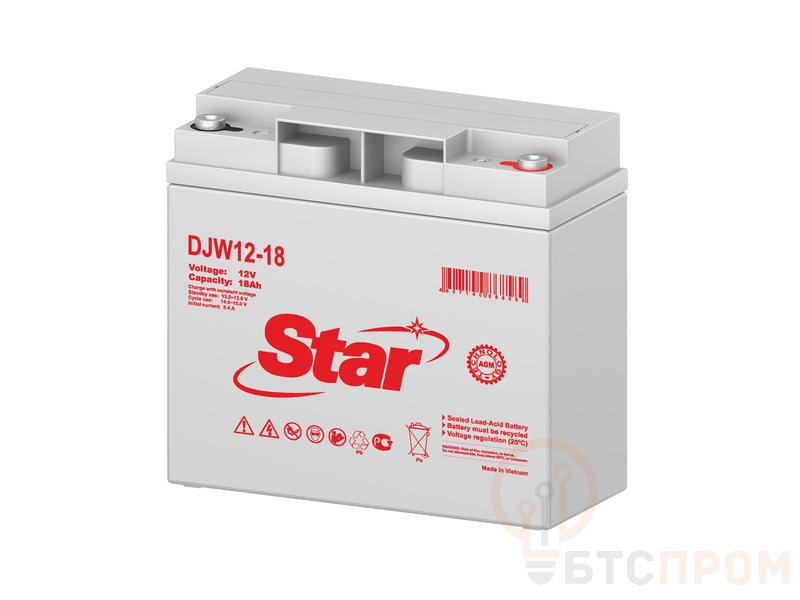 Аккумуляторная батарея Star DJW12-18 — надежный источник автономного питания с номинальным напряжением 12 В и емкостью 18 А·ч. Данная свинцово-кислотная модель выполнена по технологии AGM (Absorbent Glass Mat), что обеспечивает полную необслуживаемость, устойчивость к вибрациям и безопасную эксплуатацию в любом положении. Обладает низким саморазрядом и длительным сроком службы.