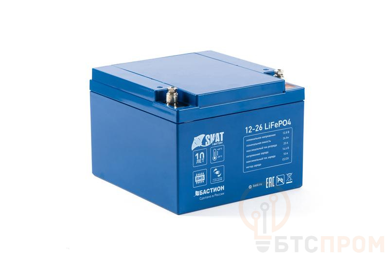 12 В, 26 Ач Li-ion АКБ, на базе LiFePO4 элементов IFR 32650, структура 4S4P Номинальное напряжение — 12,8 В, напряжение заряда — до 14 В. Максимальный ток разряда — до 20 А; ток заряда — до 10 А. Температурный режим при разряде — от -20°C до + 60°C, при заряде от 0°C. Аналог герметичного АКБ 26 Ач (AGM). Размер корпуса — 165х175х126. Вес — 8 кг. (в 3 раза легче аналогичной свинцово-кислотной АКБ). Корректная работа в ИБП вместо свинцово-кислотного АКБ.
