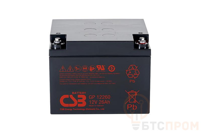 Аккумуляторная батарея CSB GP12260 – это надежный свинцово-кислотный источник питания напряжением 12 В и емкостью 26 А·ч. Модель выполнена по технологии AGM (Absorbent Glass Mat), что обеспечивает ее полную герметичность, необслуживаемость и безопасную эксплуатацию в любом положении. Благодаря низкому внутреннему сопротивлению, батарея обладает высокими токовыми характеристиками и устойчива к глубоким разрядам.