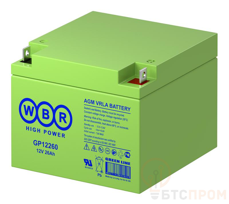Аккумуляторная батарея WBR GP12260 — это надежный свинцово-кислотный источник питания с номинальным напряжением 12 В и емкостью 26 А·ч. Модель выполнена по технологии AGM (Absorbent Glass Mat), что обеспечивает ее полную герметичность, необслуживаемость и безопасную эксплуатацию в любом положении. Благодаря клапанно-рекомбинационной системе батарея обладает устойчивостью к глубоким разрядам и минимальным саморазрядом.
