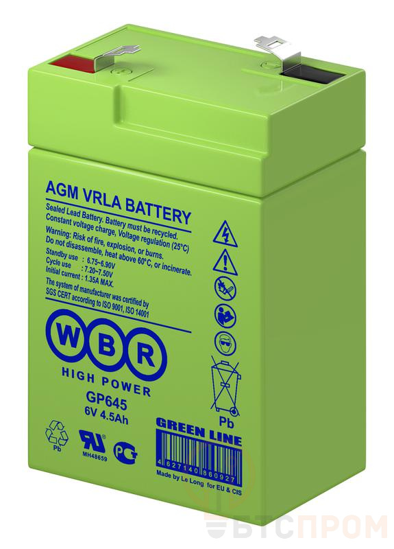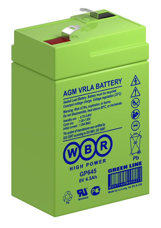 Аккумуляторная батарея WBR GP645 — это надежный источник энергии с номинальным напряжением 6 В и емкостью 4.5 А·ч. Данная свинцово-кислотная модель, выполненная по технологии AGM (Absorbent Glass Mat), является необслуживаемой и обладает устойчивостью к вибрациям. Благодаря клапанной регулировки и рекомбинации газов, батарея полностью безопасна в эксплуатации.