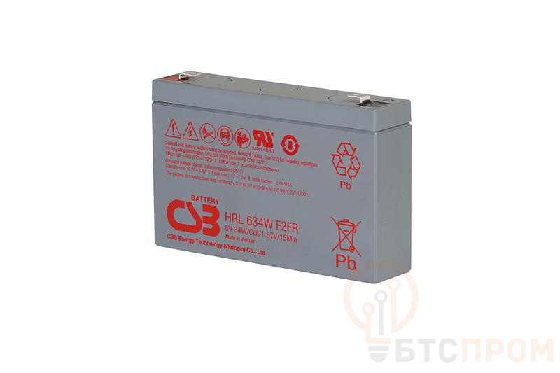 Аккумуляторная батарея CSB HRL634W F2 FR напряжением 6В и ёмкостью 9А·ч представляет собой надёжный источник резервного питания. Модель выполнена по технологии AGM (Absorbent Glass Mat) с рекомбинацией газов, что обеспечивает полностью необслуживаемую эксплуатацию и безопасную работу в любом положении.