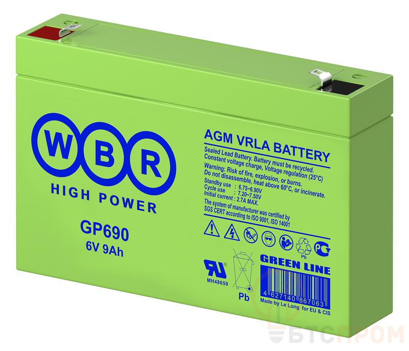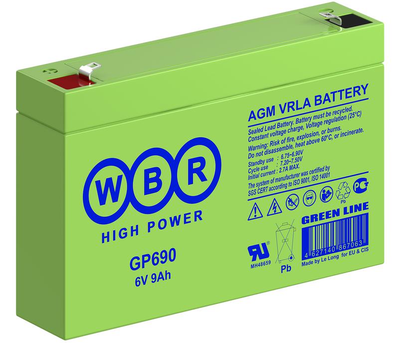Аккумуляторная батарея WBR GP690 — это надежный свинцово-кислотный источник питания с номинальным напряжением 6 В и емкостью 9 А·ч. Данная модель выполнена по технологии AGM (Absorbent Glass Mat), что обеспечивает ее полную герметичность, необслуживаемость и безопасную эксплуатацию в любом положении. Электролит абсорбирован в стекловолокне, что исключает риск протечек.