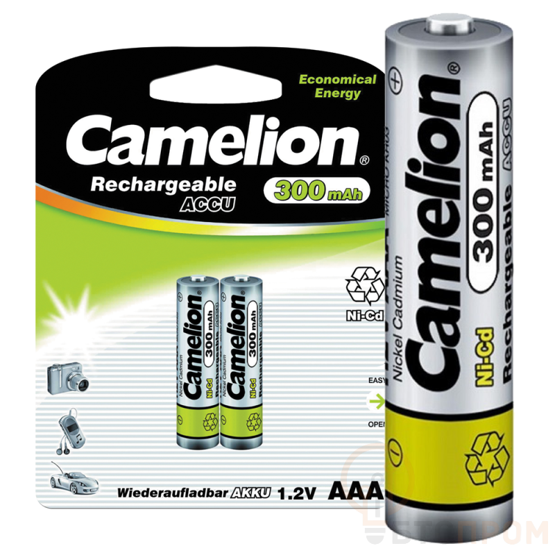 Никель-кадмиевые перезаряжаемые аккумуляторы Camelion предназначены для длительного использования в приборах. Заряжать при помощи специализированного зарядного устройства. Аккумулятор Camelion NC-AAA300BP2, напряжение 1,2В, емкость 300мА*ч, кол-во в упаковке 2 шт., размер упаковки 90x117x11 мм, использовать при температуре от - 20 до + 40 °C