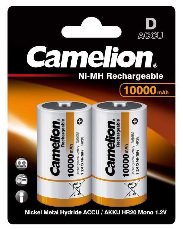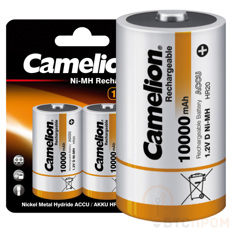 Никель-металлгидридные аккумуляторы Camelion предназначены для длительного использования в приборах. Заряжать при помощи специализированного зарядного устройства. Срок службы не менее 500 циклов заряда. Аккумулятор Camelion NH-D10000BP2, напряжение 1,2В, емкость 10000мА*ч, кол-во в упаковке 2 шт., размер упаковки 90x117x34 мм, использовать при температуре от - 20 до + 40 °C