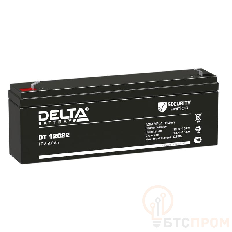 Аккумуляторная батарея Delta DT 12022. Напряжение 12В, емкость 2,2Ач. Имеет низкое внутреннее сопротивление и высокую плотность энергии. Предназначена для охранно-пожарных систем и СКУД. Срок службы 5 лет.