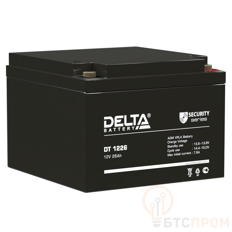 Аккумуляторная батарея Delta DT 1226. Напряжение 12В, емкость 26Ач. Имеет низкое внутреннее сопротивление и высокую плотность энергии. Предназначена для охранно-пожарных систем и СКУД. Срок службы 5 лет.