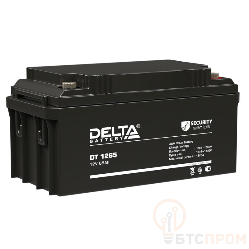 Аккумуляторная батарея Delta DT 1265. Напряжение 12В, емкость 65Ач. Имеет низкое внутреннее сопротивление и высокую плотность энергии. Предназначена для охранно-пожарных систем и СКУД. Срок службы 7 - 10 лет.