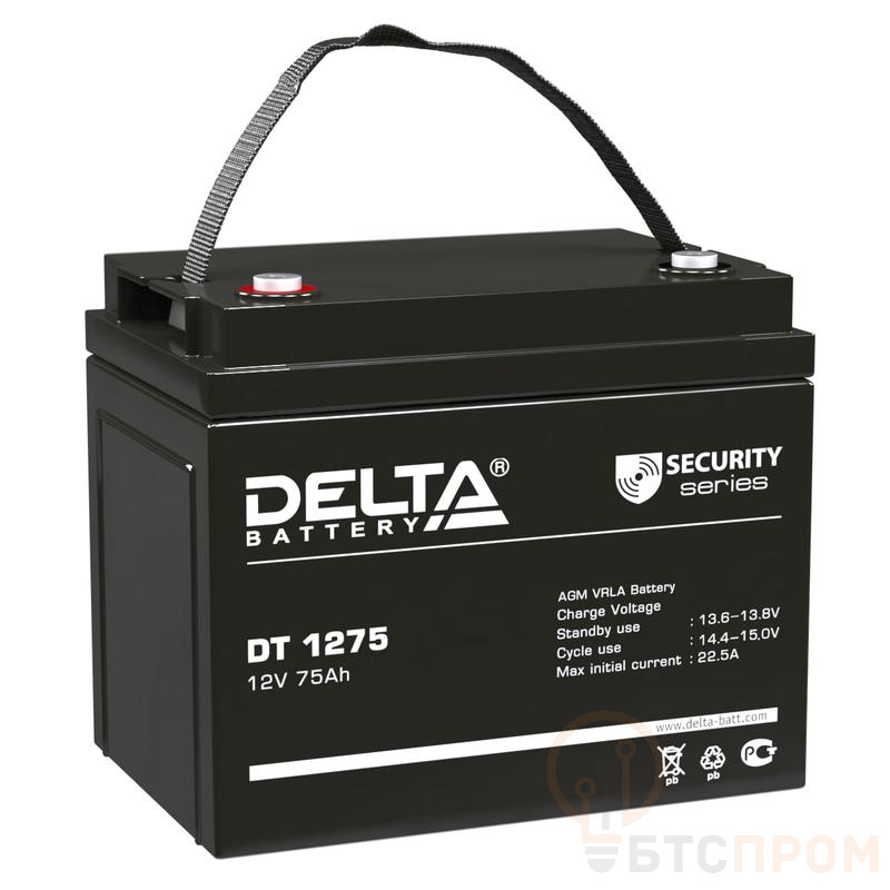 Аккумуляторная батарея Delta DT 1275. Напряжение 12В, емкость 75Ач. Имеет низкое внутреннее сопротивление и высокую плотность энергии. Предназначена для охранно-пожарных систем и СКУД. Срок службы 7 - 10 лет.
