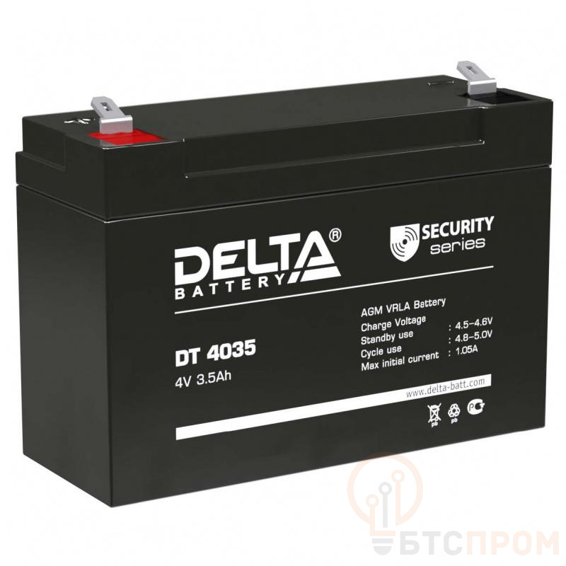 Аккумуляторная батарея Delta DT 4035. Напряжение 4В, емкость 3,5Ач. Имеет низкое внутреннее сопротивление и высокую плотность энергии. Предназначена для охранно-пожарных систем и СКУД. Срок службы 5 лет.