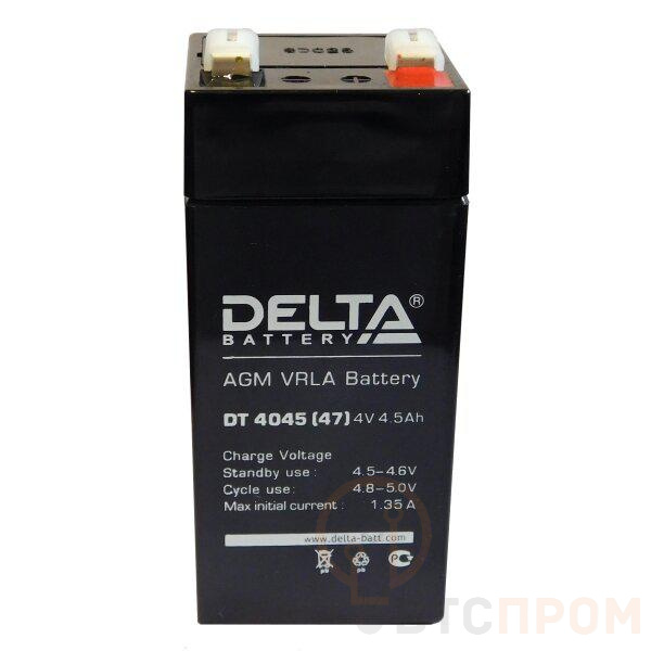 Аккумуляторная батарея Delta DT 4045. Напряжение 4В, емкость 4,5Ач. Имеет низкое внутреннее сопротивление и высокую плотность энергии. Предназначена для охранно-пожарных систем и СКУД. Срок службы 5 лет.