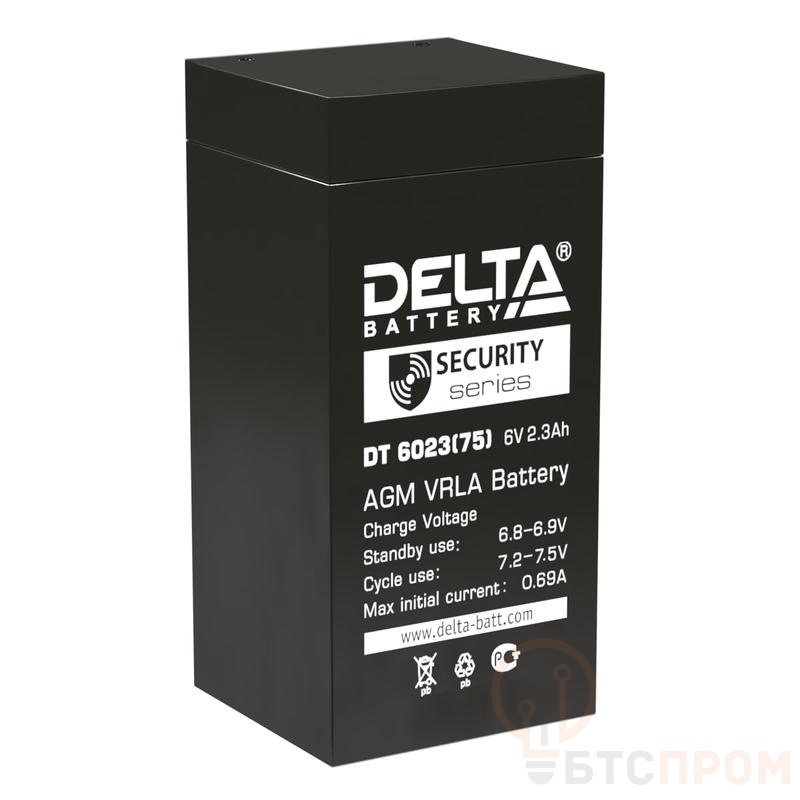 Аккумуляторная батарея Delta DT 6023 (75). Напряжение 6В, емкость 2,3Ач. Имеет низкое внутреннее сопротивление и высокую плотность энергии. Предназначена для охранно-пожарных систем и СКУД. Срок службы 5 лет.
