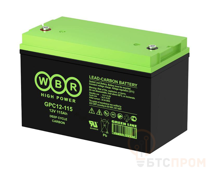 Тяговый аккумулятор WBR GPC12-115 – это надежный источник энергии для интенсивной эксплуатации. Номинальное напряжение составляет 12 В, а емкость 115 А·ч гарантирует длительное время автономной работы. Модель выполнена по технологии AGM (Absorbent Glass Mat), что обеспечивает необслуживаемость, полную герметичность и безопасную работу в любом положении.