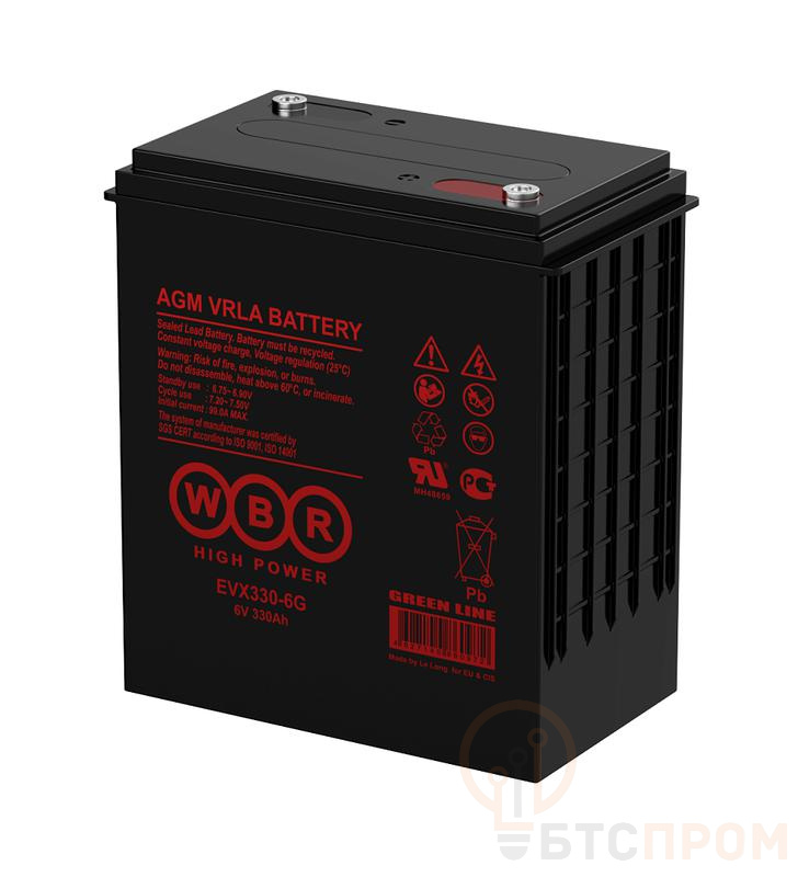 Тяговый аккумулятор WBR EVX330-6G – это мощный и надежный источник энергии, предназначенный для интенсивной циклической работы. Номинальное напряжение составляет 6 В, а емкость 330 А·ч обеспечивает длительное время автономной работы.
