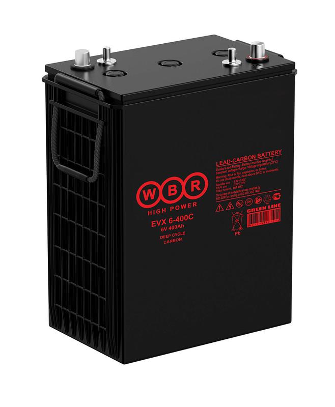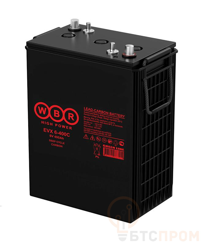 Тяговый аккумулятор WBR EVX6-400C – это надежный источник энергии для интенсивной эксплуатации. Номинальное напряжение составляет 6 В, а емкость 400 А·ч обеспечивает длительное время автономной работы. Модель выполнена по технологии AGM (Absorbent Glass Mat), что делает ее полностью необслуживаемой, устойчивой к вибрациям и безопасной в использовании благодаря герметичному корпусу и защите от утечек электролита.