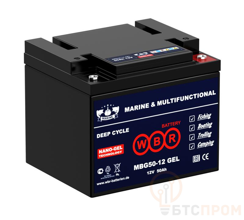 Тяговый гелевый аккумулятор WBR MBG50-12 — это надежный источник энергии для вашего морского транспорта и не только. Модель с номинальным напряжением 12 В и емкостью 50 А·ч изготовлена по передовой технологии GEL (AGM), что обеспечивает абсолютную герметичность, устойчивость к глубоким разрядам и исключает необходимость в обслуживании.