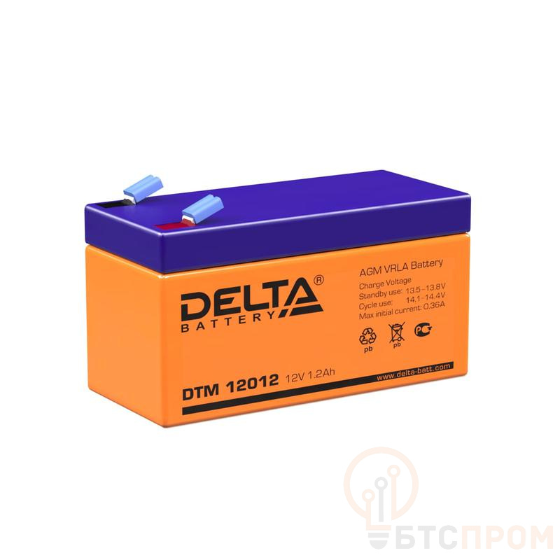 Аккумуляторная батарея Delta DTM 12012. Напряжение 12В, емкость 1,2Ач. Обладает широким спектром применения. Рекомендуется для использования в буферном и в циклическом режимах. Срок службы 6 лет.