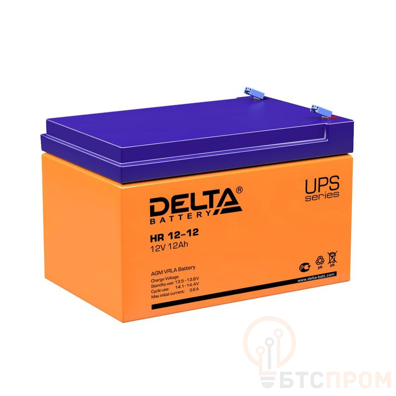 Аккумуляторная батарея Delta HR 12-12. Напряжение 12В, емкость 12Ач. Разработана для применения в ИБП, ЦОД, системах связи. Имеет превосходные разрядные характеристики. Срок службы 8 лет.