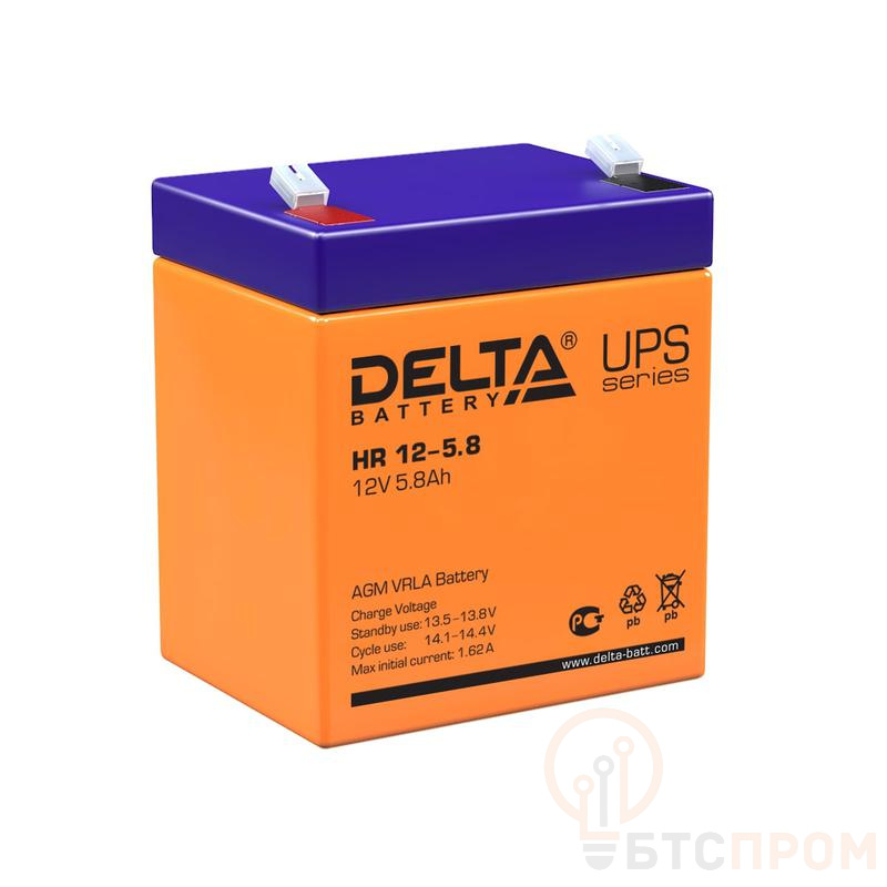 Аккумуляторная батарея Delta HR 12-5.8. Напряжение 12В, емкость 5,8Ач. Разработана для применения в ИБП, ЦОД, системах связи. Имеет превосходные разрядные характеристики. Срок службы 8 лет.