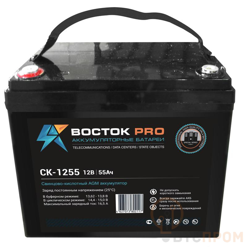 Аккумуляторная батарея ВОСТОК СК-1275. Напряжение 12 В, емкость 75 Ач. Герметизированные, необслуживаемые. Предназначены для использования в ИБП, ЦОД. Срок службы 10 лет.
