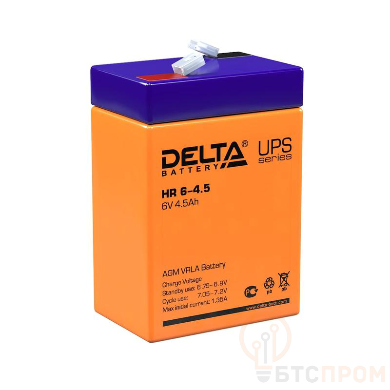 Аккумуляторная батарея Delta HR 6-4.5. Напряжение 6В, емкость 4,5Ач. Разработана для применения в ИБП, ЦОД, системах связи. Имеет превосходные разрядные характеристики. Срок службы 8 лет.