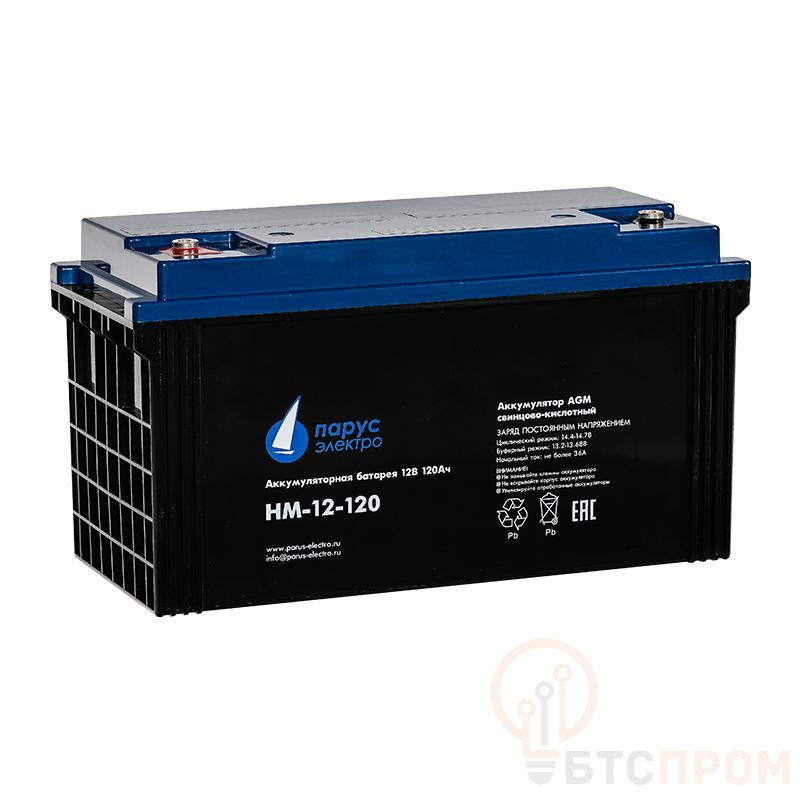 Аккумуляторная батарея HM-12-120 от бренда ПарусЭлектро — это надежный свинцово-кислотный источник питания напряжением 12 В и емкостью 120 А·ч. Модель изготовлена по технологии AGM (Absorbent Glass Mat), что обеспечивает полную необслуживаемость, высокую устойчивость к вибрациям и безопасную эксплуатацию без риска утечки электролита.