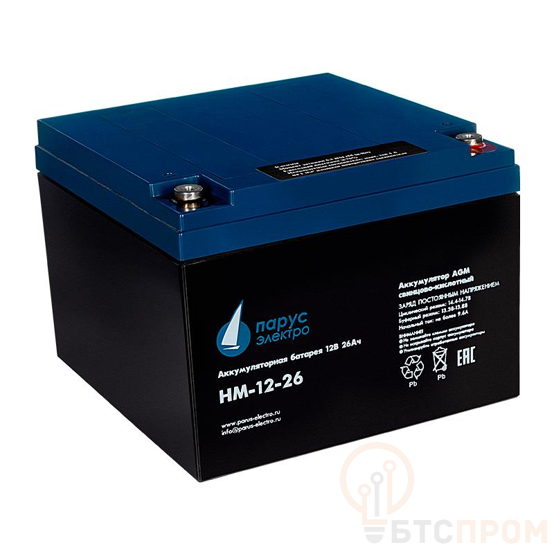 Аккумуляторная батарея HM-12-26 от бренда «ПарусЭлектро» — это надежный свинцово-кислотный источник питания, предназначенный для широкого спектра применения. Номинальное напряжение устройства составляет 12 В, а емкость — 26 А·ч, что обеспечивает длительную и стабильную работу подключенного оборудования.
