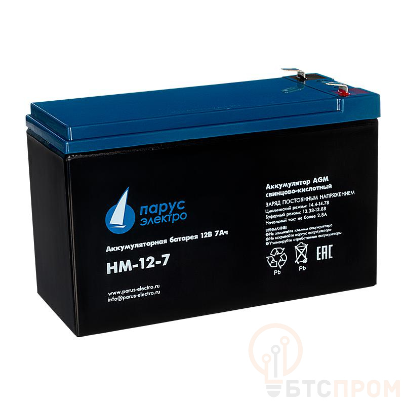 Аккумуляторная батарея HM-12-7 от бренда ПарусЭлектро — это надежный свинцово-кислотный источник питания с номинальным напряжением 12 В и емкостью 7 А·ч. Конструкция выполнена по технологии AGM (Absorbent Glass Mat), что обеспечивает полную герметичность, безопасную эксплуатацию в любом положении и абсолютное отсутствие необходимости в обслуживании.