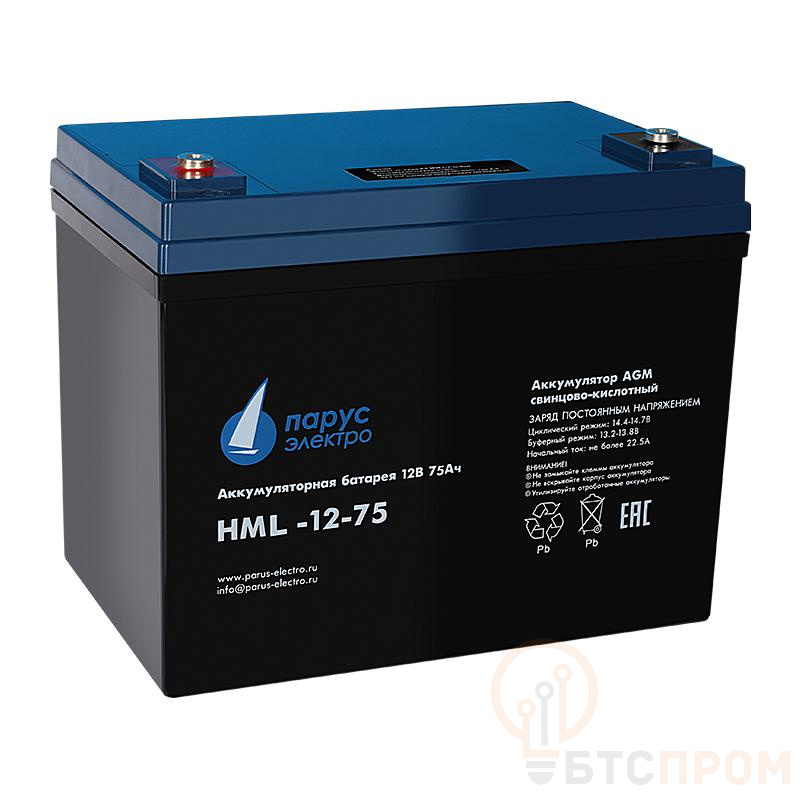 Свинцово-кислотная аккумуляторная батарея HML-12-75 от бренда ПарусЭлектро — это надежный источник резервного и постоянного питания напряжением 12 В и емкостью 75 А·ч. Модель изготовлена по технологии AGM (Absorbent Glass Mat), что обеспечивает полную необслуживаемость, высокую устойчивость к вибрациям и безопасную эксплуатацию в любом положении. Электролит впитан в стекловолокно, что исключает риск протечек.