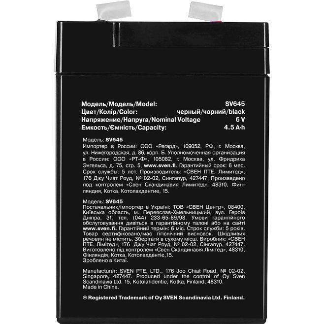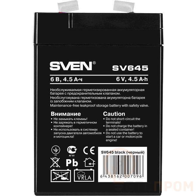 Батарея SV 645 (6В 4.5А.ч) напряжение 6В емкость 4.5А.ч макс. ток разряда 67А макс. ток заряда 1.35А свинцово-кислотная типа AGM тип клемм F1 Д/Ш/В 70/47/100 0.8 кг SVEN 1000370459
