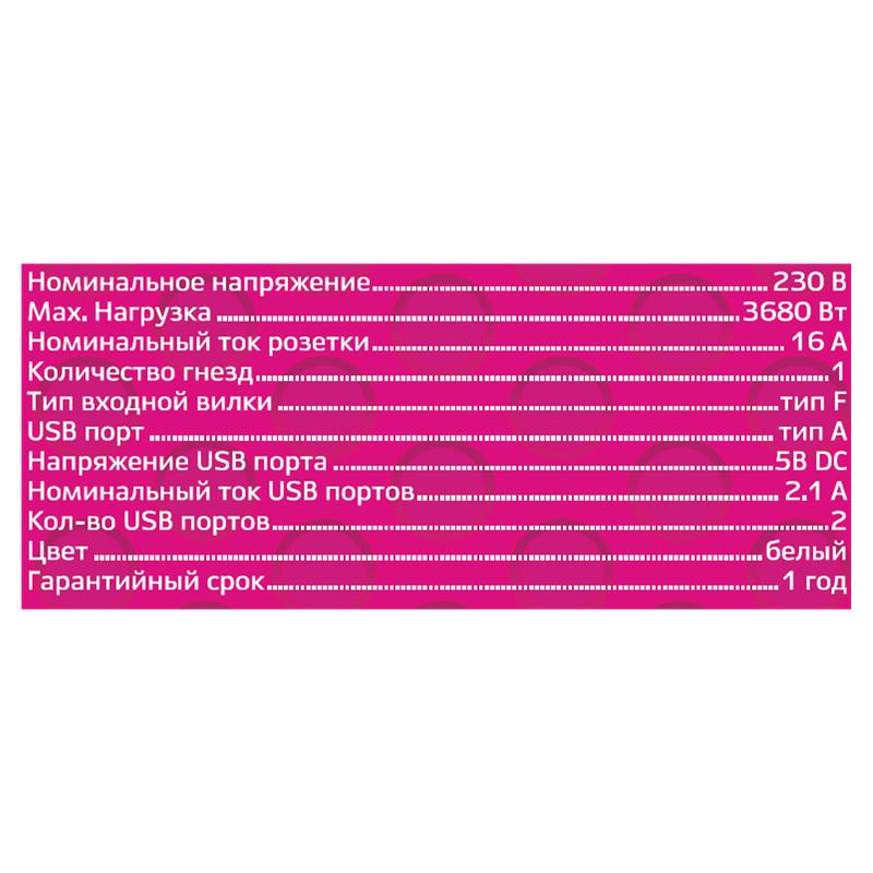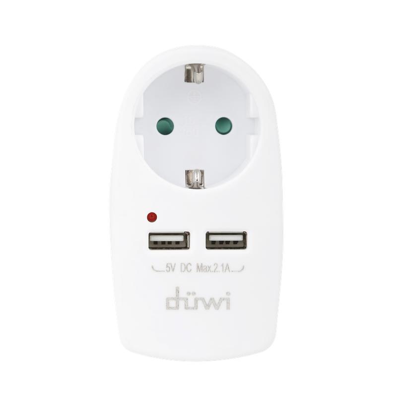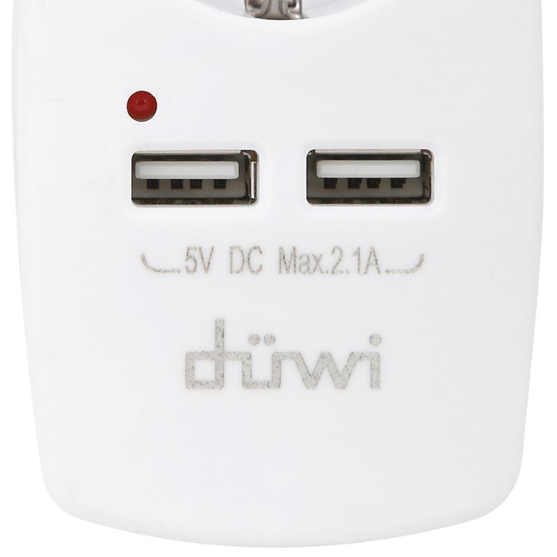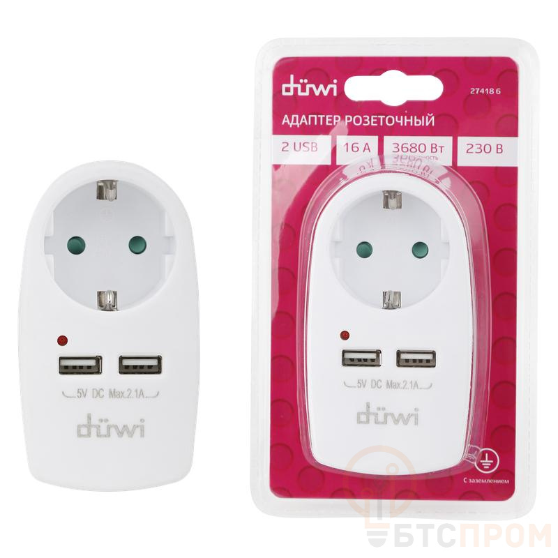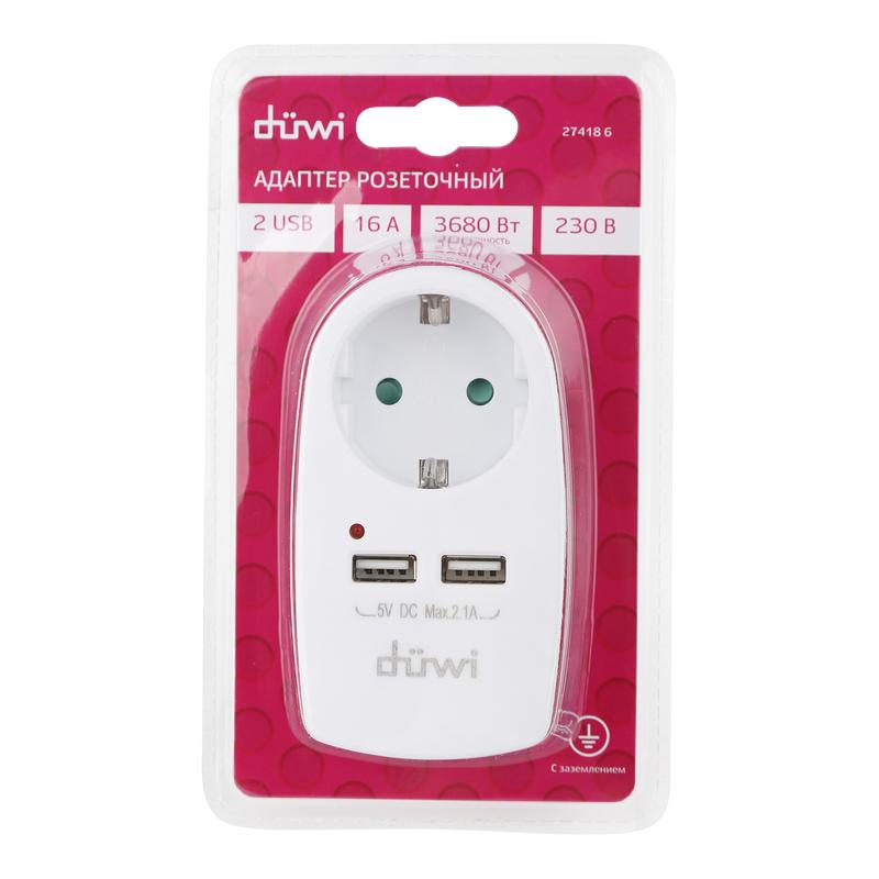 Адаптер розеточный 1 гнездо + 2 USB порта на европейскую вилку с заземлением 16А 230В 3680Вт IP20 бел. Duwi 27418 6
