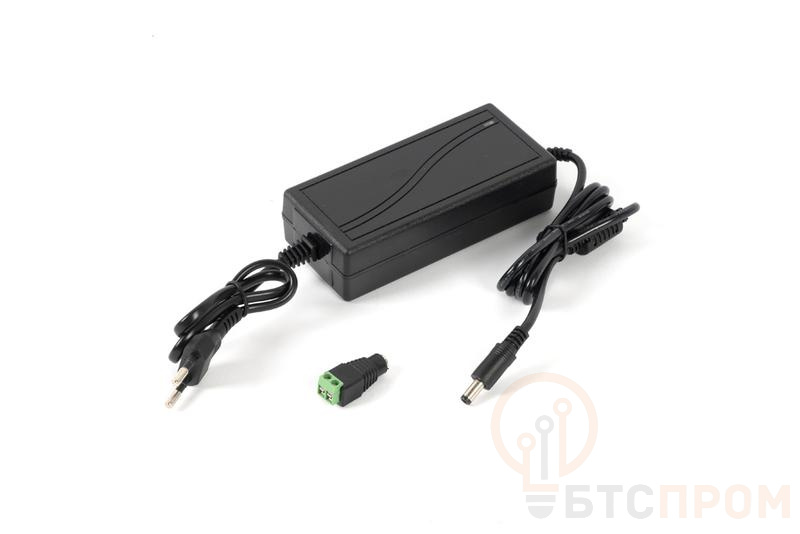 12В, 5А. Напряжение питающей сети 110-245 В переменного тока. Защита выхода от КЗ. Пластиковый корпус IP20. Подключение питания - сетевая вилка, подключение нагрузки - штекер 5,5х2,1 мм, переходник на клеммы в комплекте. Габаритные размеры - 50х30х110 мм.