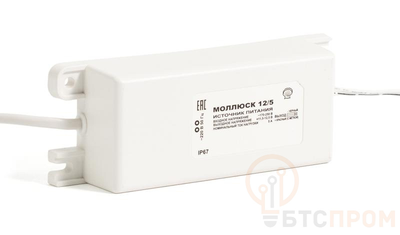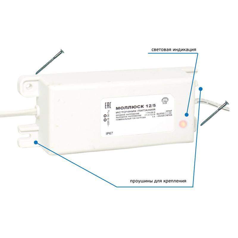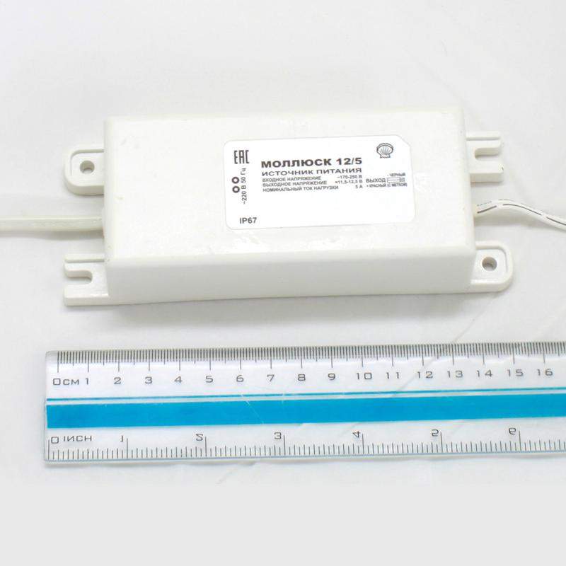Источник питания 12 В, 5 А для скрытой установки в кабельные каналы, распаечные коробки, кожух видеокамеры, габариты — 150х56х35 мм, защита выхода от КЗ и перегрузки, прочность изоляции 3 кВ, проушины для крепления, корпус IP67.