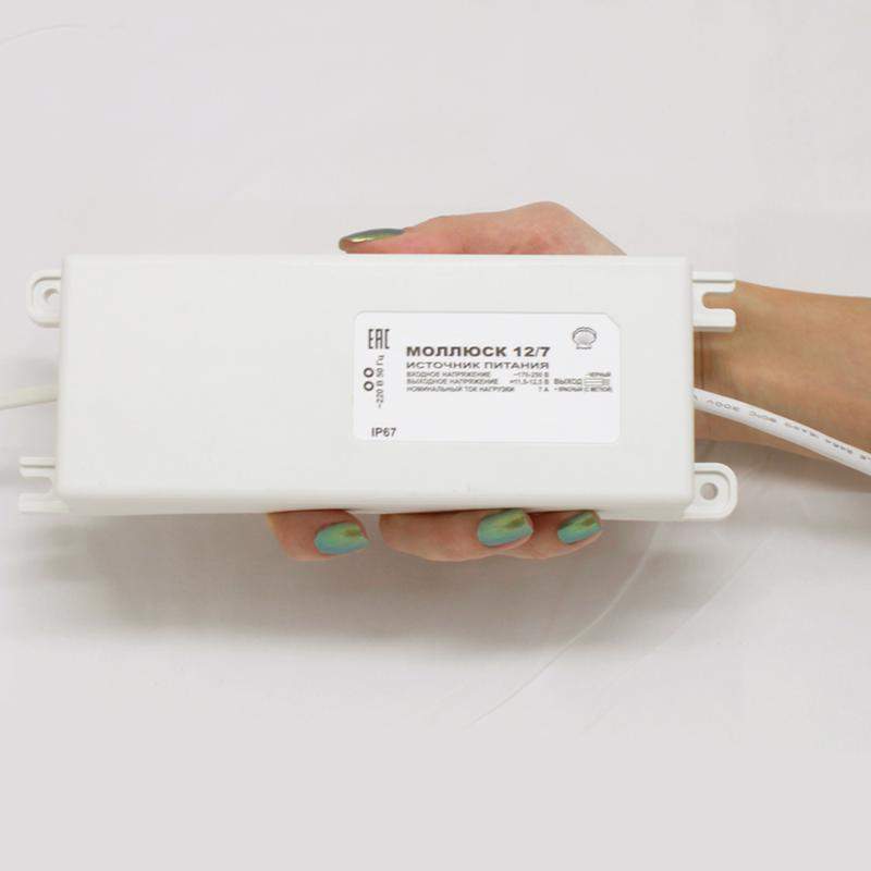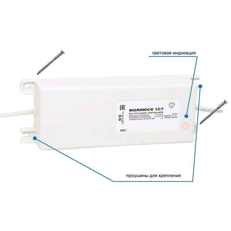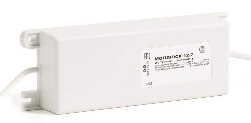 12 В, 7 А, габариты — 205х70х40 мм, защита выхода от КЗ и перегрузки, прочность изоляции 3 кВ, проушины для крепления, корпус IP67.