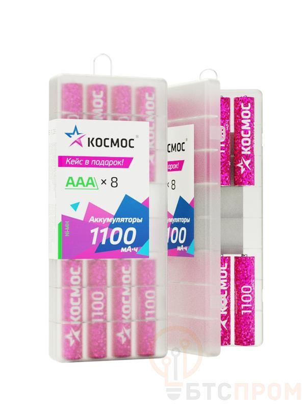 Ni-Mh (никель-металлогидридные) аккумуляторы Космос в специальном кейсе для хранения – заменяют обычные батарейки типоразмера ААА (также называют «мизиньчиковые», на приборах-потребителях может обозначаться как LR03, R03, UM4). Быстро окупятся - можно заряжать сотни раз, экономя на обычных батарейках. В упаковке 8 шт – достаточно для 4 разных приборов - и удобный пластиковый кейс. Емкость 1100 мАч – для мощных устройств. Важно – перед первым использованием аккумуляторы нужно зарядить.
