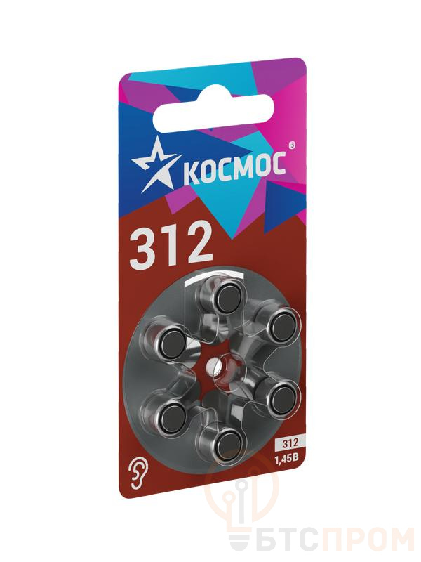 Элемент питания воздушно-цинковая для слуховых аппаратов ZA312 (312 PR41 DA312 V312A) 1.45В (уп.6шт) КОСМОС KOCZA-312BL6