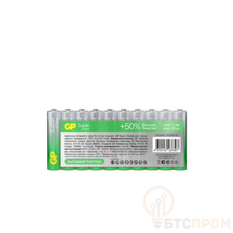Элемент питания алкалиновый AAA/LR03 1.5В Super Alkaline G-Tech 24AA21-2CRSWC10 100/800 (уп.10шт) GP 19959