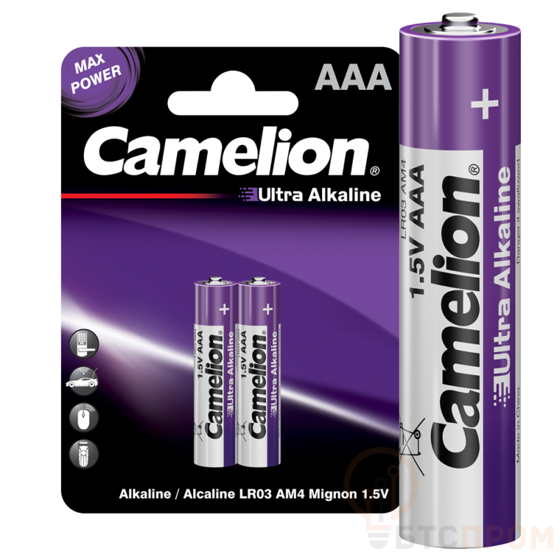 Улучшенные щелочные батарейки для устройств с высоким и импульсным энергопотреблением. Максимально широкий спектр применения. Батарейка Camelion LR03-BP2UT, напряжение 1,5В, емкость 1250 мА*ч, кол-во в упаковке 2 шт., размер упаковки 84x114x11 мм,использовать при температуре от -18 до + 55 °C, хранить в сухом помещении при температуре от +15 до +25°C. Срок хранения 10 лет. Улучшенные щелочные батарейки. Проявляют повышенную работоспобность в устройствах с импульсным энергопотреблением.