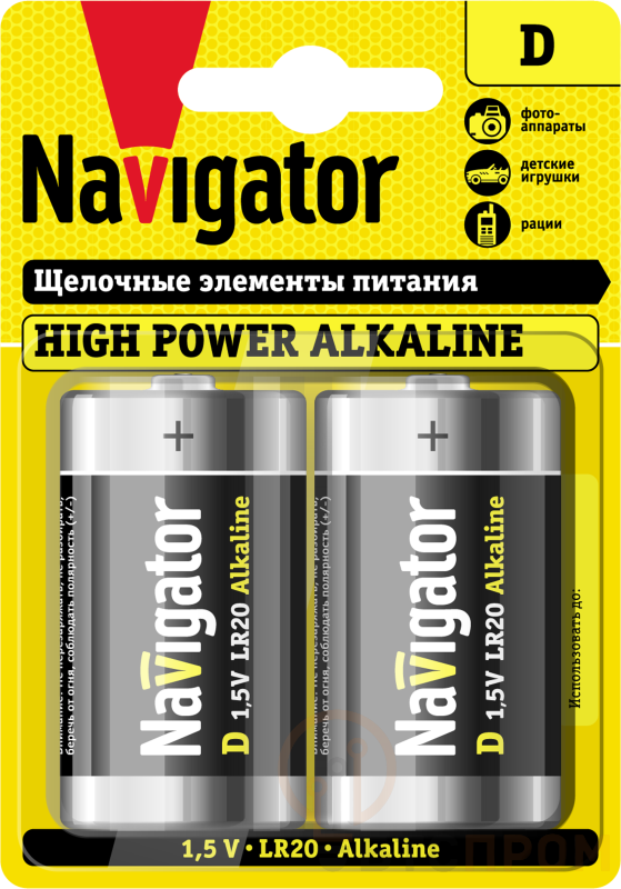 Элемент питания 94 755 NBT-NE-LR20-BP2 (блист.2шт) Navigator 17004 представляет собой цилиндрическую щелочно-марганцевую батарейку типоразмера D/UM-1. Поставляется в упаковке по 2 шт.