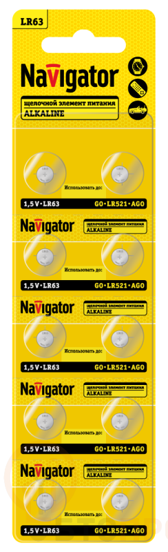 Элемент питания алкалиновый "таблетка" 95 664 NBT-07 (LR63 AG0 LR521 BP10) (блист.10шт) Navigator 95664