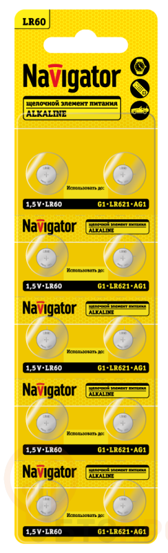 Элемент питания алкалиновый "таблетка" 95 665 NBT-08 (LR60 AG1 LR621 BP10) (блист.10шт) Navigator 95665