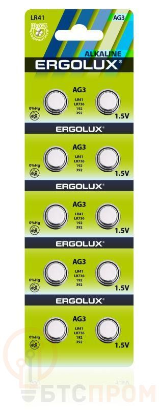 Элемент питания алкалиновый "таблетка" LR41/LR736/192/392 AG 3 AG3-BP10 для часов BL-10 (уп.10шт) Ergolux 14314