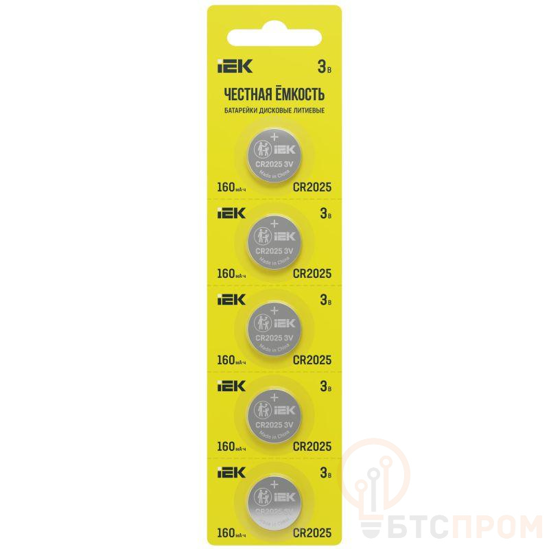Батарейка дисковая литиевая IEK CR2025, 5 шт. на блистере. IEK применяет технологии, которые позволяют создать батарейки с длительным временем работы и стабильным качеством. Батарейки «Честная ёмкость» производятся в соответствии с международным стандартом IEC и проходят двойной контроль качества каждой партии. Батарейка подходит для использования в весах, гирляндах, калькуляторах, автомобильных ключах и брелоках автосигнализаций, пультах ворот и шлагбаума, часах, трекерах, материнских платах компьютера или ноутбука, глюкометрах, пульсометрах, термометрах и других устройствах. Соответствует ГОСТ 12.2.007.12, ГОСТ Р МЭК 55086-1 (IEC 55086-1).
