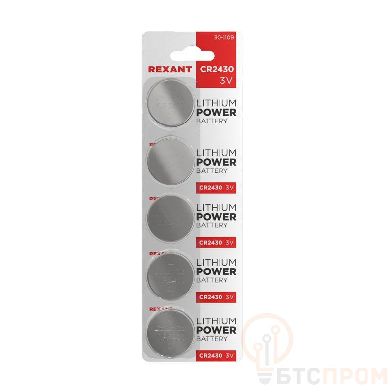 Литиевые батарейки CR2430 REXANT - 5 шт в блистерной упаковке с удобной отрывной перфорацией. Номинальное напряжение: 3 V Номинальная емкость: 300 mAh Тип батарейки : Li/MnO2